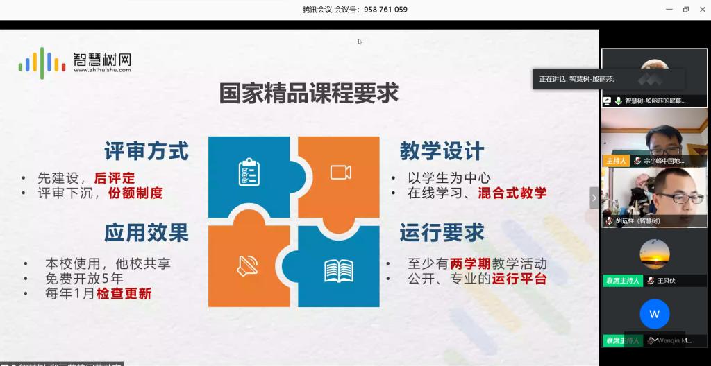MOOC建设研讨会在腾讯会议上召开。会议特邀智慧树公司地大南望山课栈栈长胡运祥和高级课程顾问殷丽莎参加。研讨会由学院教学副院长宗小峰主持,部分教师参加了研讨会。