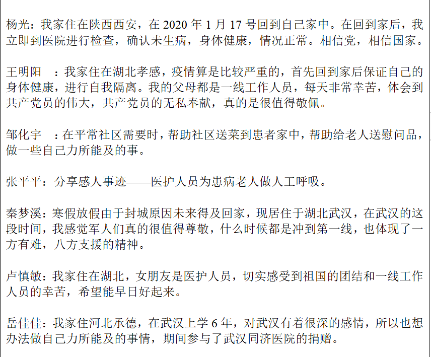 贺江同志谈到,“我待在武汉,当前疫情防控形势严峻,身在一线的医生护士非常辛苦。作为普通党员,我们首先要服从党组织安排,做好防护工作;第二,我们要学习各种管控措施与相关的文件精神,加强思想理论武装;第三,我们要尽自己的努力,做好宣传工作或志愿服务工作,为疫情防控贡献自己的力量,一起努力,共战疫情。”