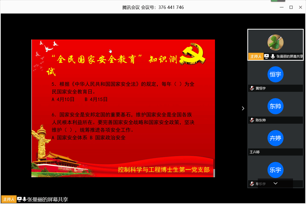 控制科学与工程博士生第二党支部在支部书记王婕的带领下开展了主题为“牢固树立总体国家安全观”的支部主题党日活动。此次活动,大家深入学习了习近平总书记关于总体国家安全观的系列重要论述,牢固树立和认真贯彻总体国家安全观,组织大家进行了知识竞赛测试,并学习了教育部应对新冠肺炎疫情工作领导小组组织的学校疫情防控专家报告视频会,重点学习张文宏教授讲授的如何做好学校疫情防控工作主题报告。