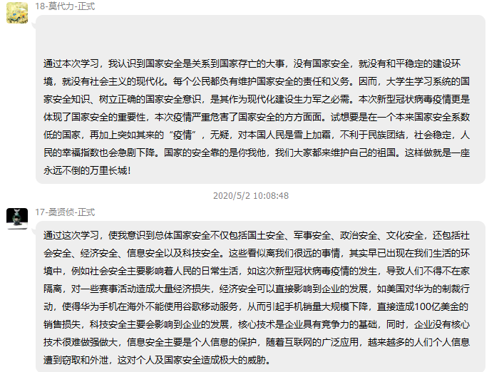 2019级博士生马斯科和2019级博士生黎育朋两位同志针对牢固树立和认真贯彻总体国家安全观,发表了自己的一些感想。两位同学分别阐述了国家安全的定义和国家安全的重大意义,指出当前国家安全面临的挑战并强调我们大学生也应当参与到国家安全工作中去,国家安全需要全民参与,这是我们身为中国公民的责任和义务。