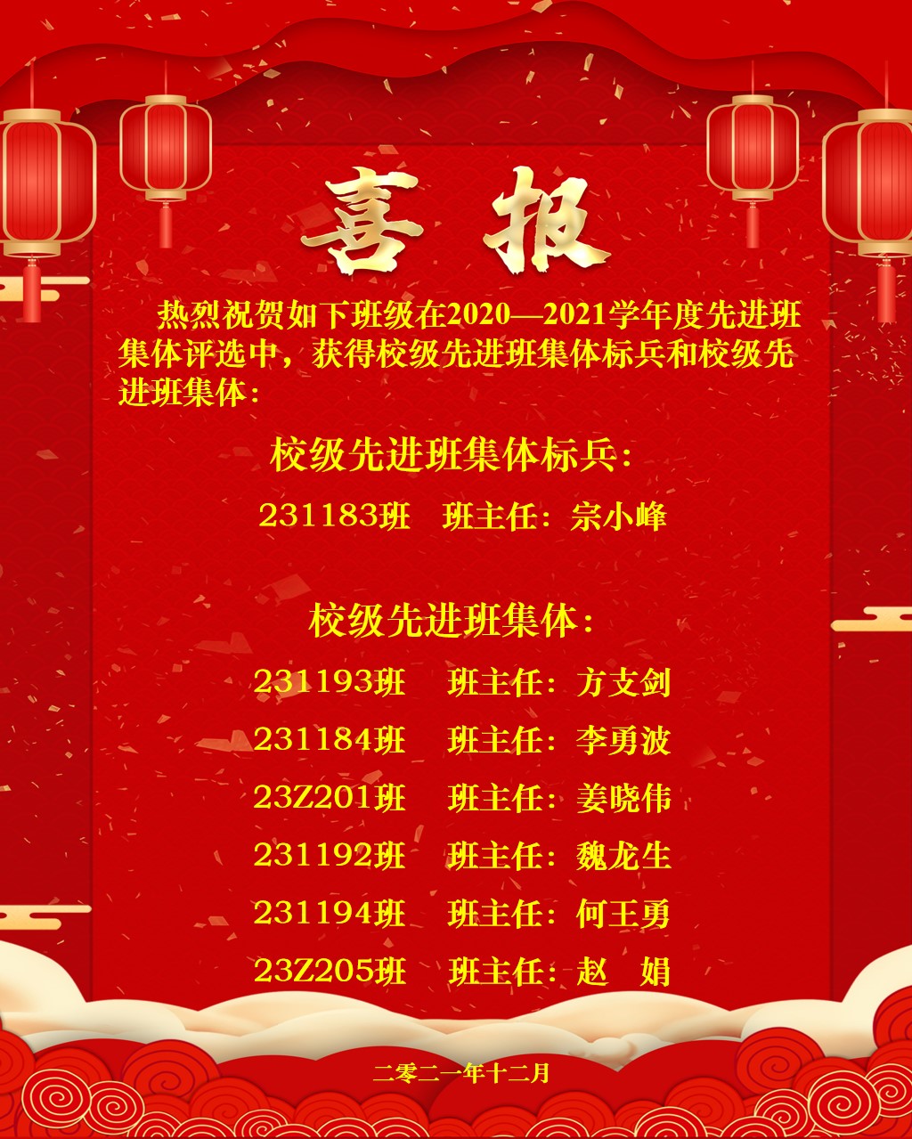 根据《关于做好2020-2021学年度先进班集体(标兵)评选工作的通知》、《关于开展2020-2021学年先进班集体标兵评审答辩工作的通知》,经过学院自评、学校评审,评定先进班集体标兵(综合奖)20个、先进班集体标兵(单项奖)7个、先进班集体104个,成人色情 以下班级获得校级先进班集体标兵、校级先进班集体: