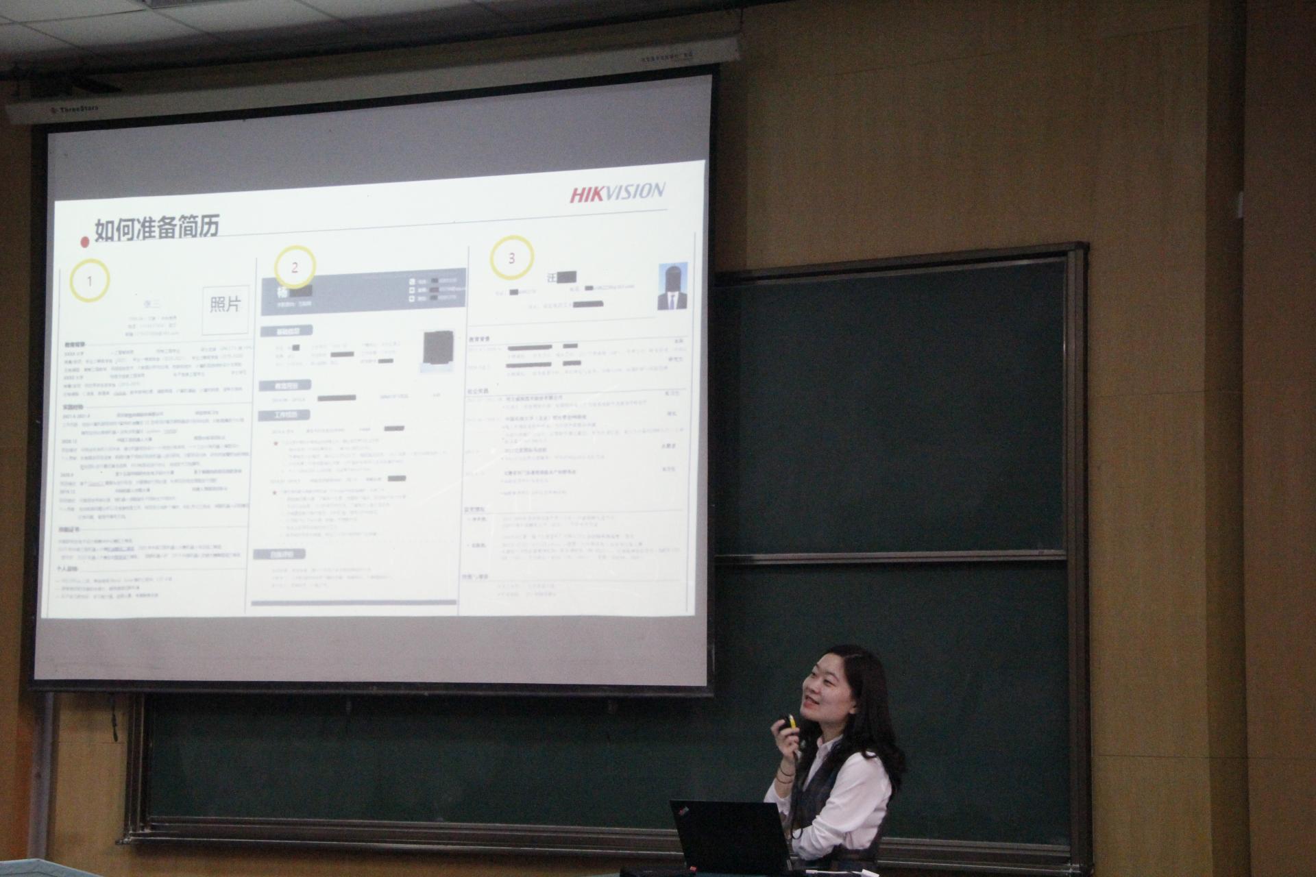 紧接着,杭州海康威视数字股份有限公司武汉研发中心高级人力资源经理谢璐进行《提前走好职场路——大学生就业指导系列讲座》专题讲座,谢经理以“毕业五年后,你会在哪里”这个问题切入,从如何进行职业选择、企业需要什么样的人才、我现在可以做什么三个部分进行讲授,从学生的角度出发帮助学生对自己进行清晰的职业规划,最后,留下了“我是自动化专业的学生,我学了什么,适合做什么,未来可以做什么”的思考题给同学们。
