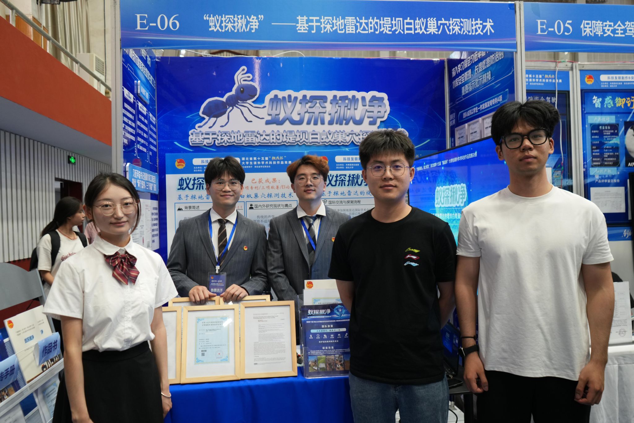 由宋俊磊教授、薛伟教授指导的《“蚁探揪净”——基于探地雷达的堤坝白蚁巢穴探测技术》项目,荣获科技发明制作B类湖北省一等奖。该项目由黄鹏春、张治轩、彭姣、王志航、杨正等5名硕士学生组成。该项目面向堤坝白蚁危害这一重大安全隐患,针对蚁巢探测中的“难收集、难提取、难识别”的问题,以双随机介质模型、自适应增益算法、BY-Net智能识别模型及雷达数据三维化技术为核心,研发了全流程智能化的蚁巢探测系统,显著提升了堤坝白蚁巢穴探测的精准度与效率,为保障水利工程安全运行、构建现代水利防护体系提供了创新技术支撑。