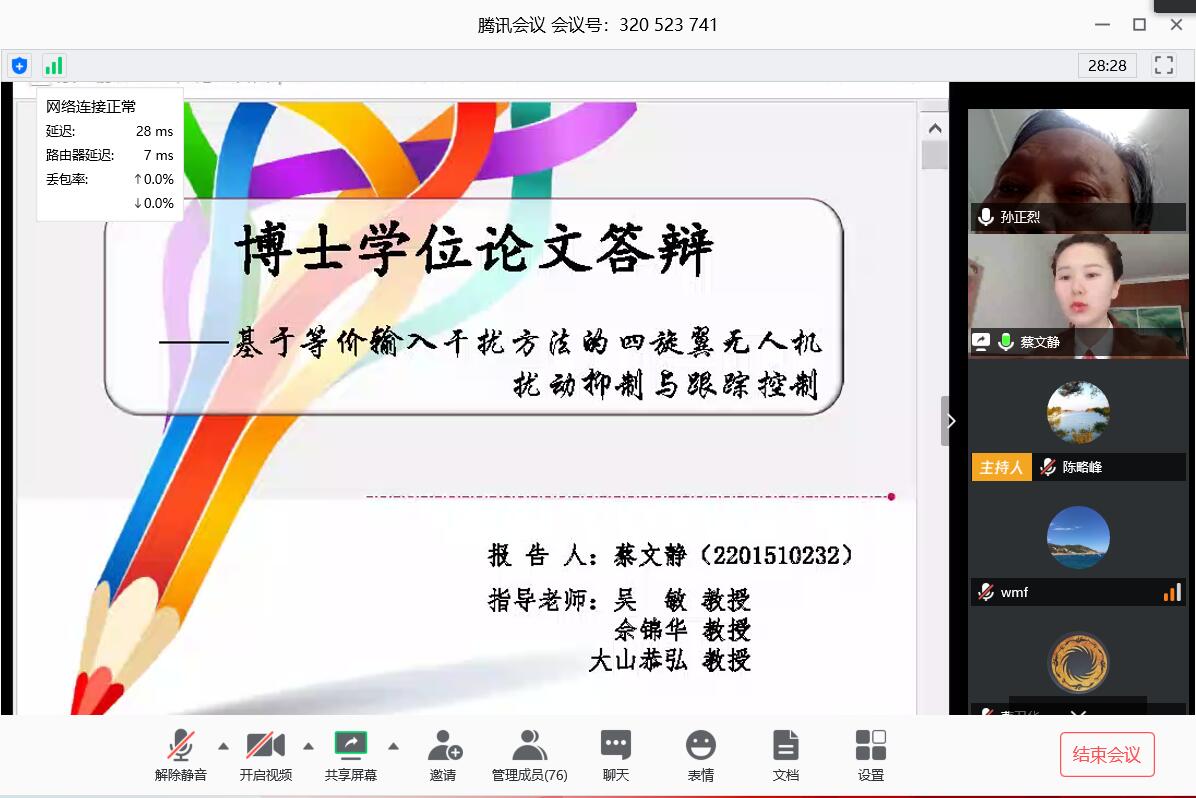 2020年博士研究生答辩批准书》,并提前在学院主页发布答辩公告和答辩海报。答辩秘书在设备调试和无记名投票系统方面做了精心准备,并进行了在线模拟答辩。在答辩过程中,从宣布答辩委员会成员名单,主席介绍答辩程序,导师介绍研究生情况,答辩人报告博士学位论文主要内容,答辩委员会成员就论文有关问题提问、答辩人答问,宣读评阅专家意见以及导师对学位论文的学术评语,答辩委员会评议、无记名投票、宣读答辩决议,到答辩人致辞和视频截屏合影留念,全程交流顺畅,一气呵成,效果良好。整个答辩过程,由专人录音录像,相关人员全程在线督导。