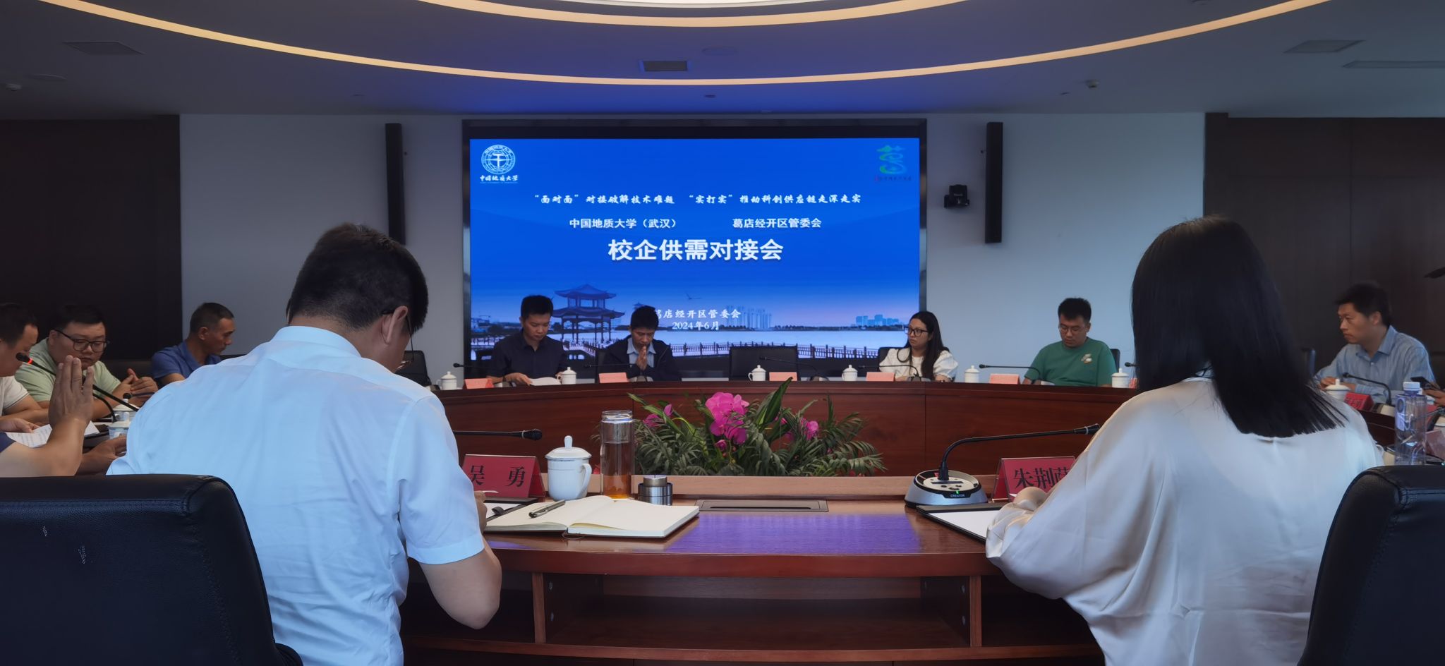 在对接会现场,学院党委书记朱荆萨介绍了学校和学院在人才培养、科技创新、成果转化方面取得的系列成就。葛店经开区党工委委员、管委会副主任吴勇详细介绍了葛店经开区产业发展情况以及在科技创新、成果转化等方面的四有优势,希望双方深化校企合作,共同推动科创供应链建设落地落实。