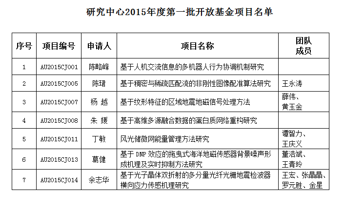 根据《复杂系统先进控制与智能地学仪器研究中心2015开放基金项目申请指南》和开放基金申请通知,至申请截止日共收到14项开放基金项目申请书,按照“公平竞争,择优支持”的原则,研究中心学术委员会外审专家对所有开放基金项目申请书进行了评审。经院学术委员会审议,拟资助 “基于人机交流信息的多机器人行为协调机制研究”等7个项目作为2015年度第一批开放基金项目,现予以公示。公示时间:2015年9月12日至9月15日。公示期间,如对项目资助有异议,请以书面形式反馈学院办公室。