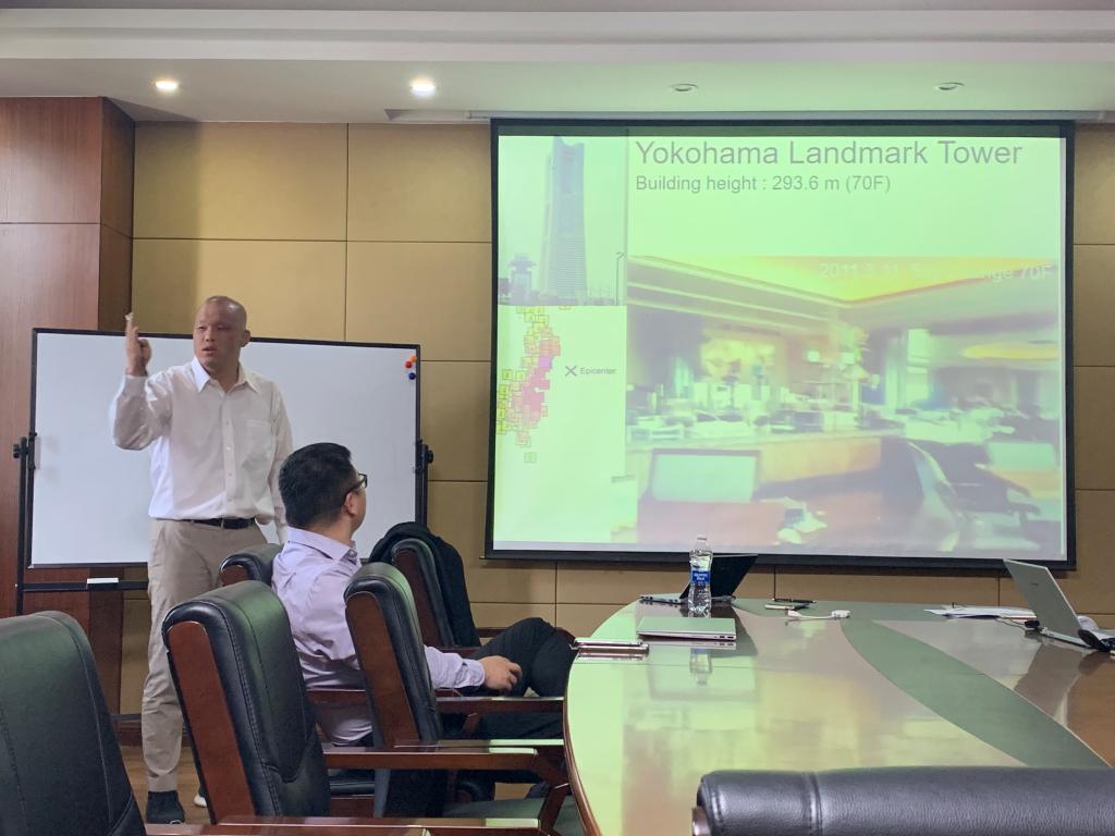 佐藤大树副教授的报告题目为《Response Prediction of Passive Controlled Building with Passive-type Dampers Considering its Performance Decrement under Long-Period Ground Motion》。他介绍了日本每年地震的发生情况和对高层建筑的影响以及余震对于室内人员的危害,重点介绍了减震器对于地震的抑制效果,并对地震的抑制性能作了分析和介绍。