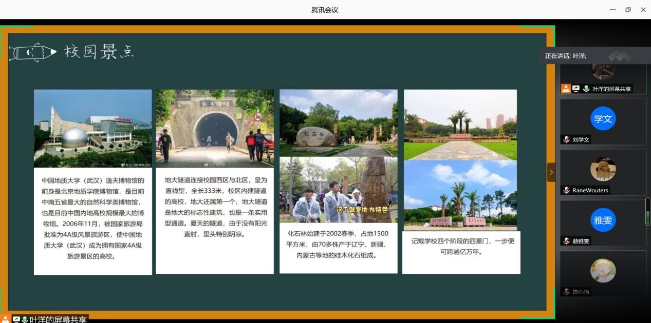(武汉)是国家“211工程”、“985工程优势学科创新平台”重点建设高校、国家“双一流”建设高校,地球科学领域进入ESI学科排名前1‰,被誉为“中国地球科学的最高学府”。叶洋同学还介绍了学校的特色活动,零点升旗,新年音乐会,校运会开幕式。