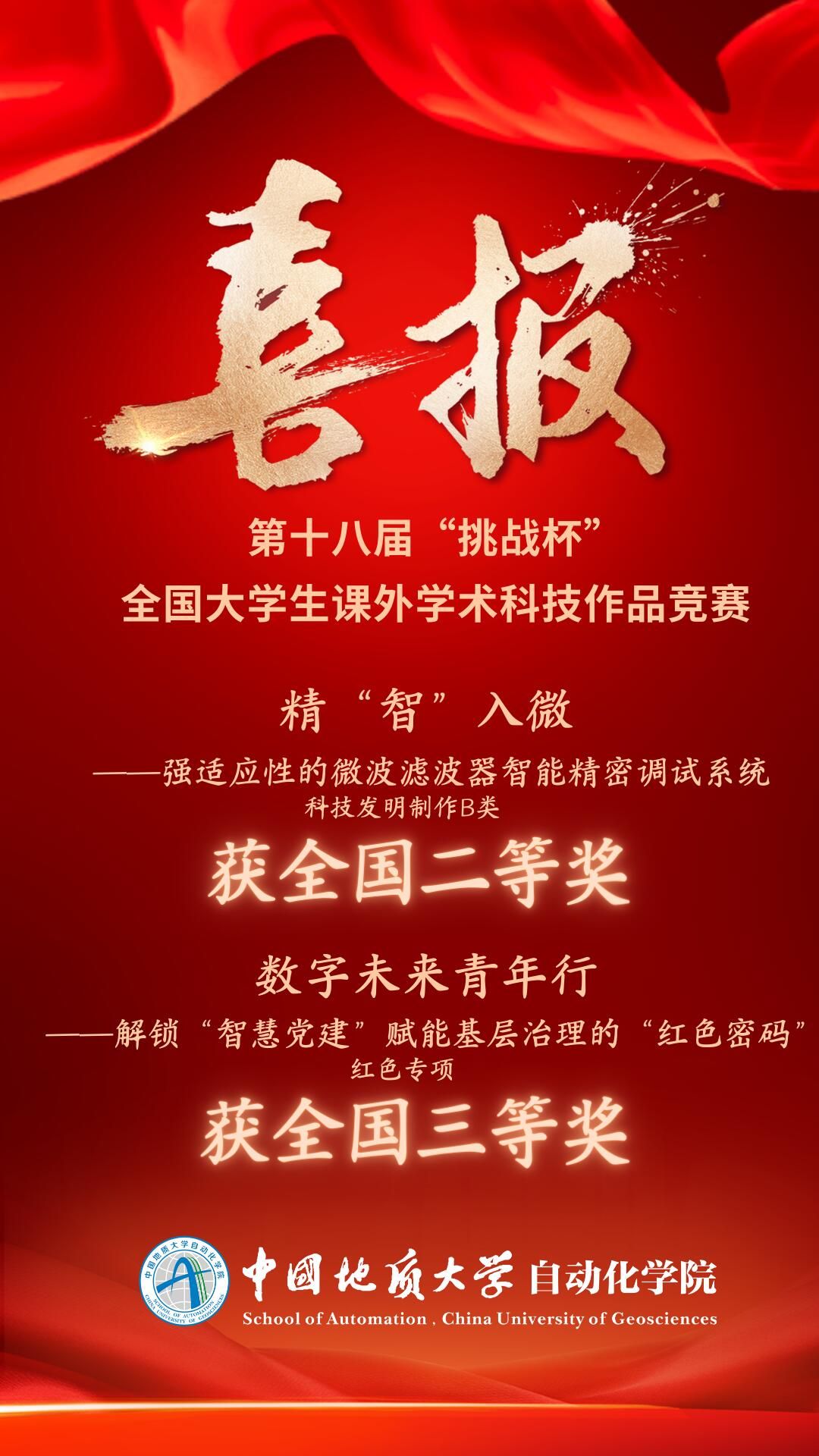 报送的2件参赛作品均为首次参赛,且顺利挺进国赛,分别斩获主体赛全国二等奖,红色专项活动全国三等奖,取得了学院在“挑战杯”历史上的最好成绩!
