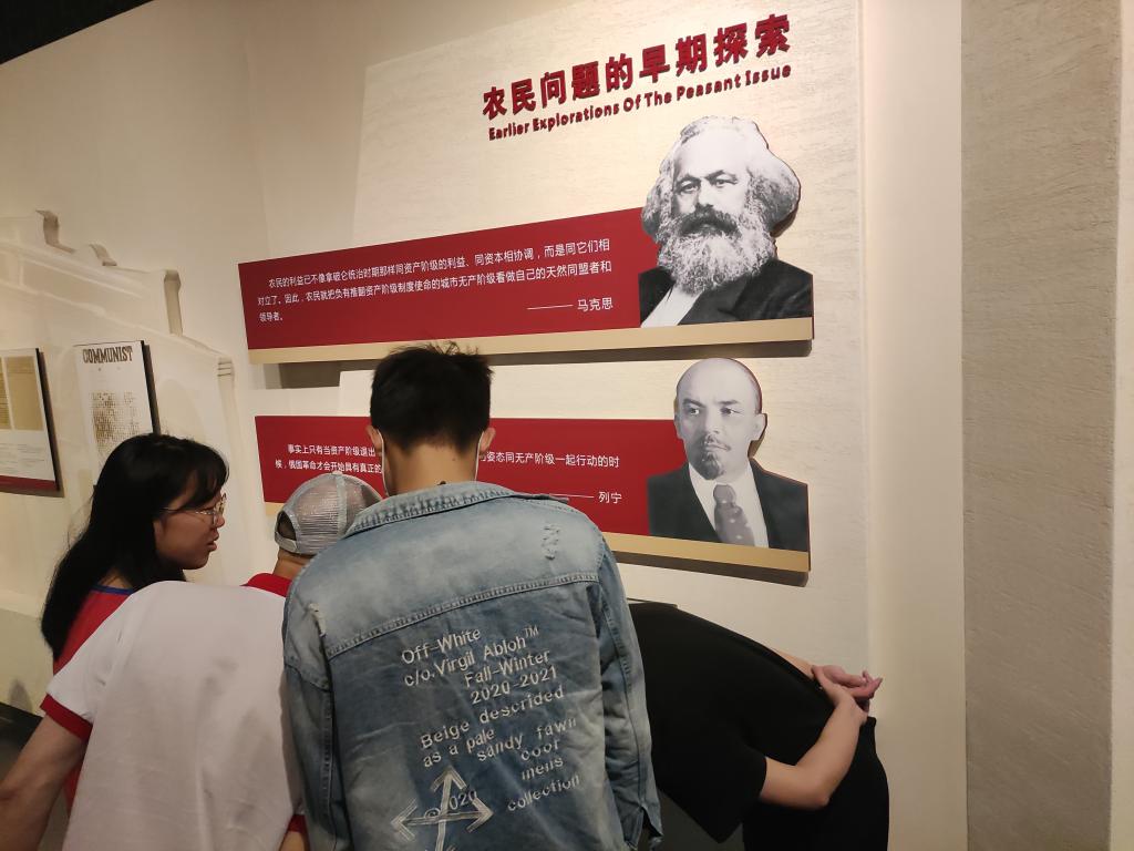 我们来到二楼的纪念博物馆,探索与奠基五个大红字夺目而来,支部成员便驻足参观与思考,他们面对的是刻画在墙上的毛泽东同志与学员们,仿佛当时农讲所中发生的各种学习生活情景扑面而来。