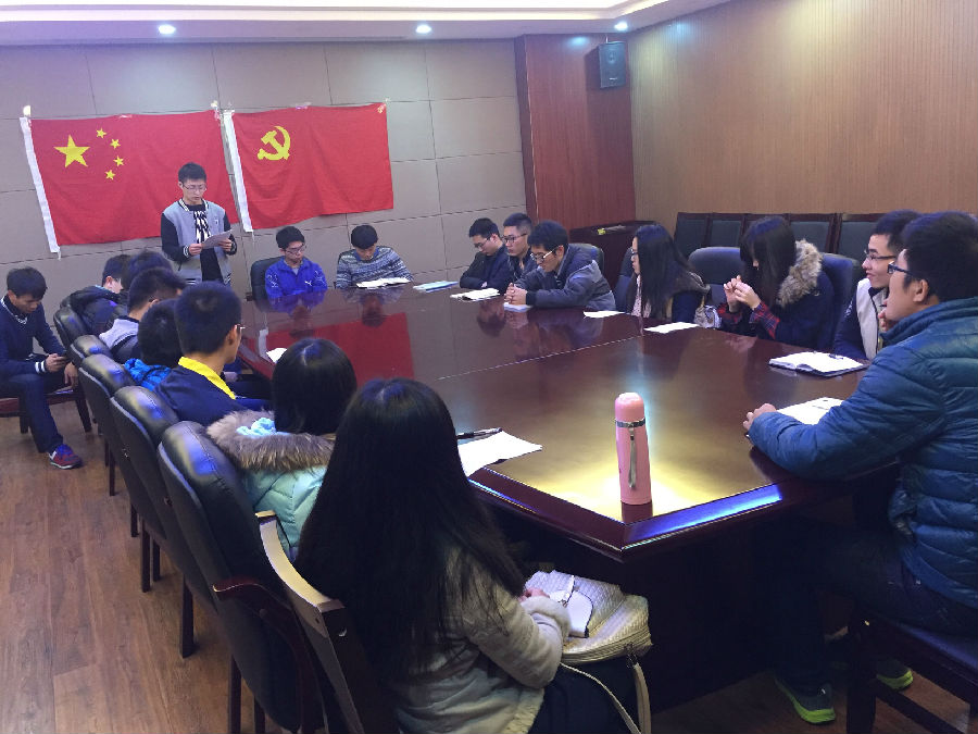 首先,会议讨论了关于蔡文静、徐云朝同志按期入党的事项,蔡文静、徐云朝同志在会议上宣读入党转正申请书,对自己预备期间的情况进行总结,经支部所有正式党员无记名投票表决后一致同意两位同志按期转正;会议第二项是支部成员就实事话题进行讨论,主要包括“南方供暖”、“国企产业改革”、“我国风电资源的利用情况”、“习马会”、“习主席谴责IS”、“G20峰会”等话题;最后组织了一个“解手链”游戏,意在增进同学之间的感情,培养大家解决问题的能力。整个会议持续近两个小时,最后会议在轻松愉快的氛围下结束。