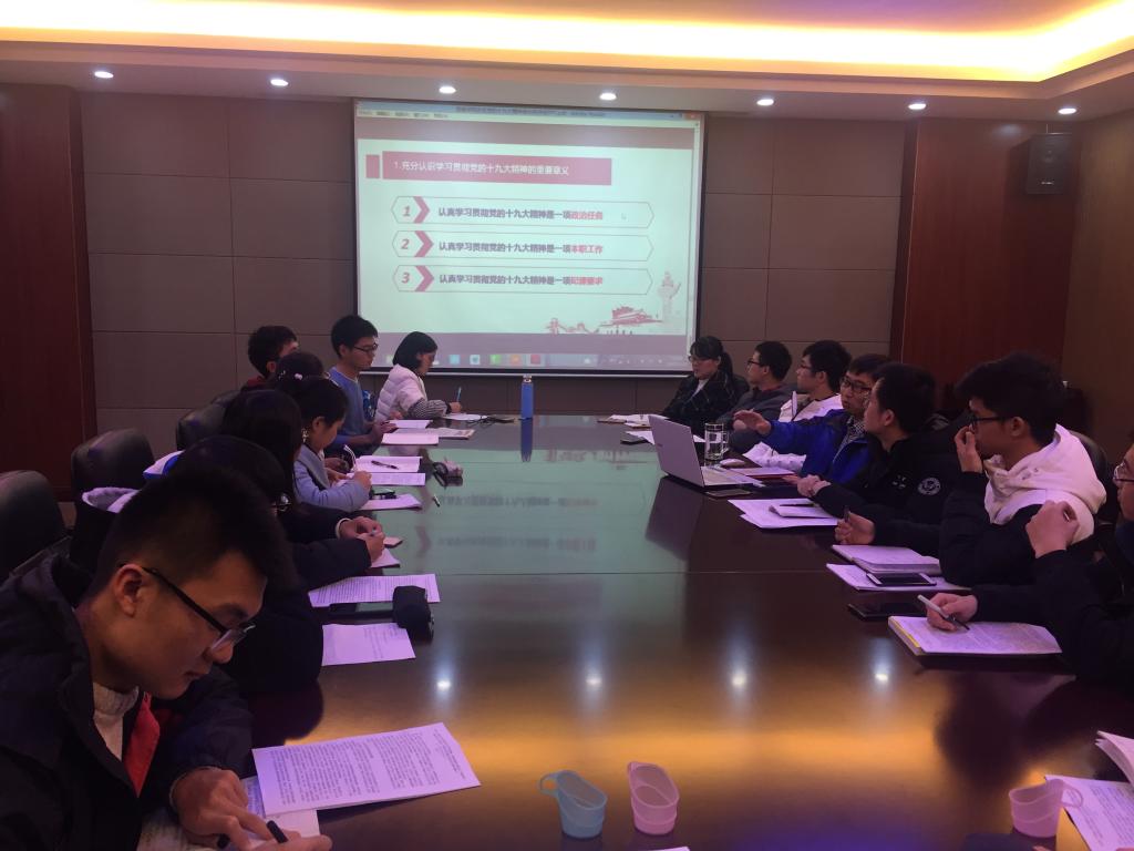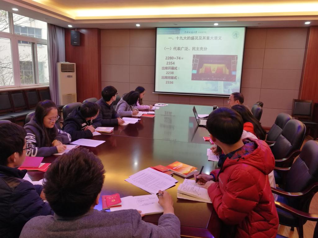 党委书记董浩斌、副院长曹卫华、副院长金星、副院长陈鑫、党委副书记何建新、团委书记谭文伦及办公室组织人事秘书孔娟参加学生党支部支部会议,带领学生党员学习党的十九大精神。