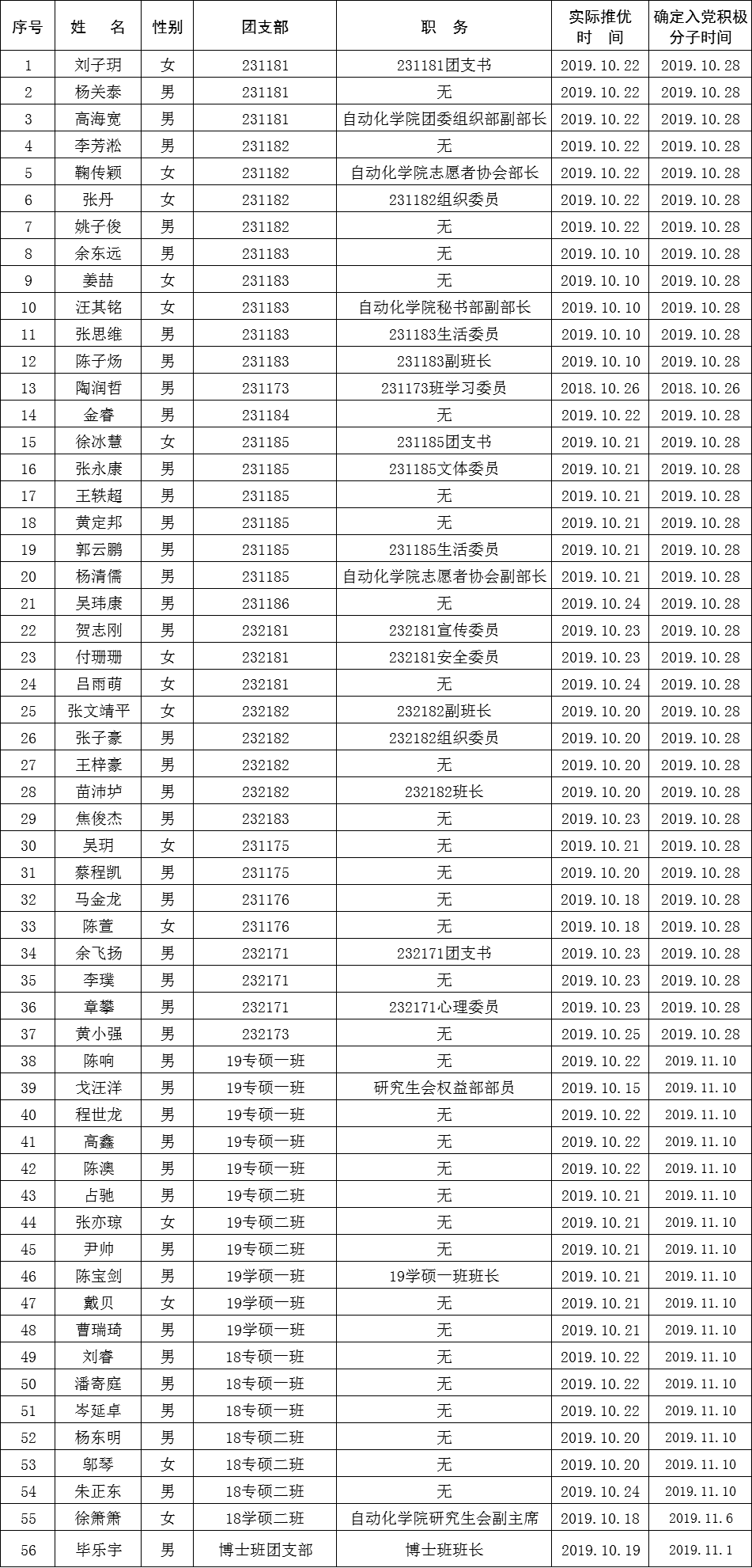 经过学院各党支部慎重考虑,从本科生、研究生团支部推荐的优秀青年中确定成人色情 第十一期入党积极分子培训班学员56人,先将名单公示如下:
