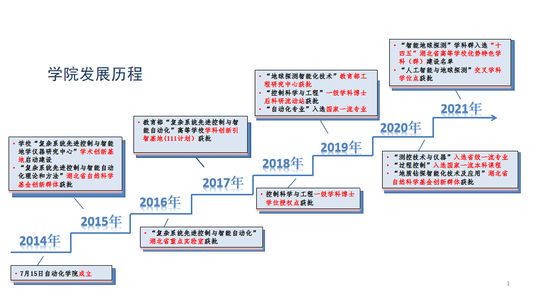 自成立以来,明确了一流的师资要在一流的学科建设中培养,在高水平的科研工作中锤炼,在高质量的社会服务中深造。当前,学院专业、学科、科研体系逐步完善,现有控制科学与工程博士后科研流动站、控制科学与工程一级学科博士学位授权点、控制科学与工程一级学科硕士学位授权点、电子信息专业硕士学位授权点,自动化、测控技术与仪器2个本科专业,其中自动化专业于2019年入选首批国家级一流本科专业建设点,测控技术与仪器专业于2020年入选湖北省一流本科专业建设点。