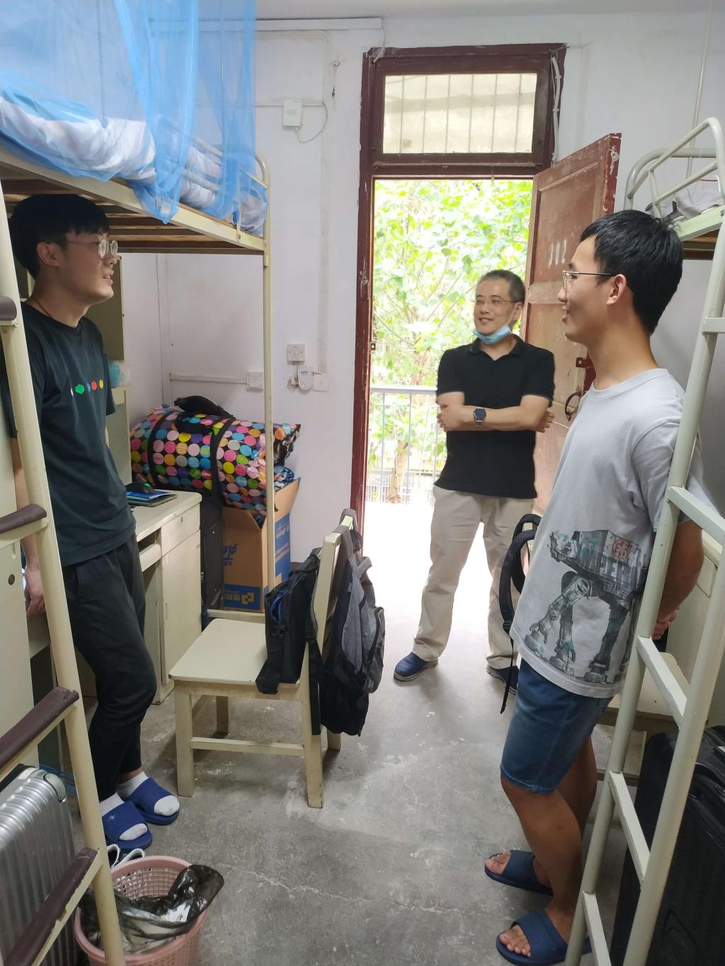 学院老师们一走进宿舍,学生们早已准备就位,主动向老师们问好并交流。董书记叮嘱同学要照顾好自己,增强安全意识,遇到问题及时与师长进行沟通交流。同学之间尤其是室友之间要相互包容,和睦相处,曹院长、何书记向同学们强调宿舍风气建设的重要性,同学之间要互相包容,互相帮助,营造良好的积极的宿舍风气,这是学风、院风建设的基础。同时,要尽快融入大学的生活,专业的学习是充满挑战的,希望同学们树立远大理想抱负,认真学习专业知识,将来为社会创造价值。陈鑫院长、黄兰华老师一行走访了研究生宿舍,询问了研究生的科研开展状况,希望大家充分利用时间,认真开展科学研究,提高创新实践能力。面对老师们的叮咛与关心,同学们个个精神抖擞,干劲十足,对即将展开的大学生活充满期待。