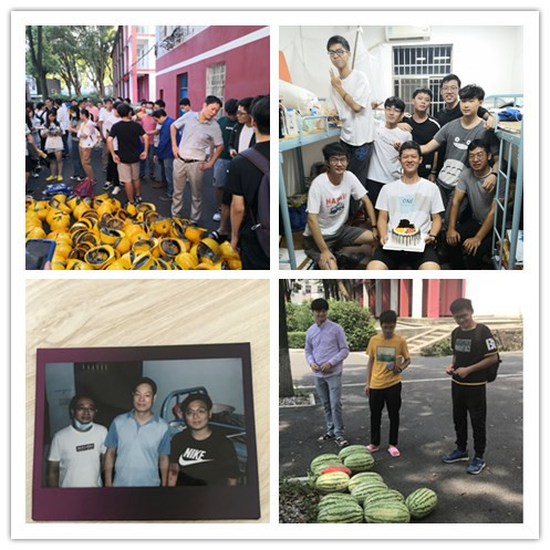 图16 带队教师向学生发放安全帽安全服(左上),学生在寝室过生日(右上),教师在宿舍与学生用“拍立得”合影(左下),学生吃西瓜解暑(右下)