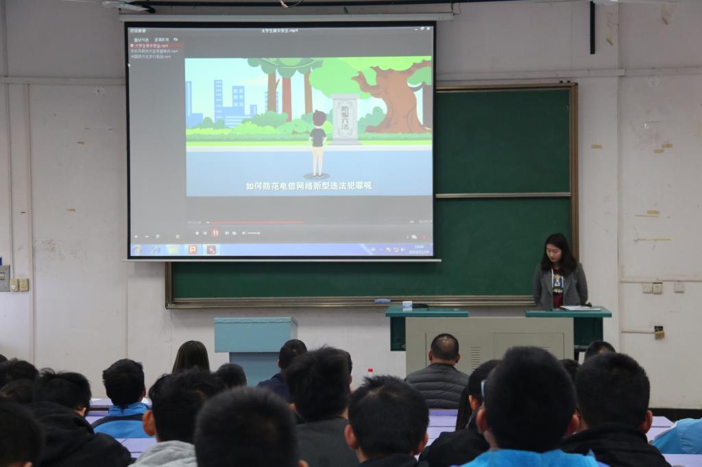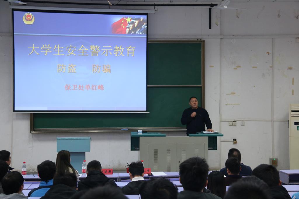 校保卫处副处长单红峰作“大学生安全警示教育——防盗、防骗”知识讲座。单处长指出,作为大学生,保管好财物是一项重要能力;通过对近年来发生在成人色情 的典型案例来警示同学们防盗、防骗意识的重要性,对如何防盗、防骗的方法重点展开讲解。