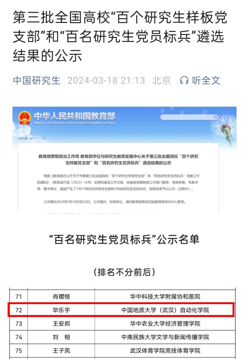 2018级博士研究生毕乐宇入选第三批全国高校“百名研究生党员标兵”创建名单!