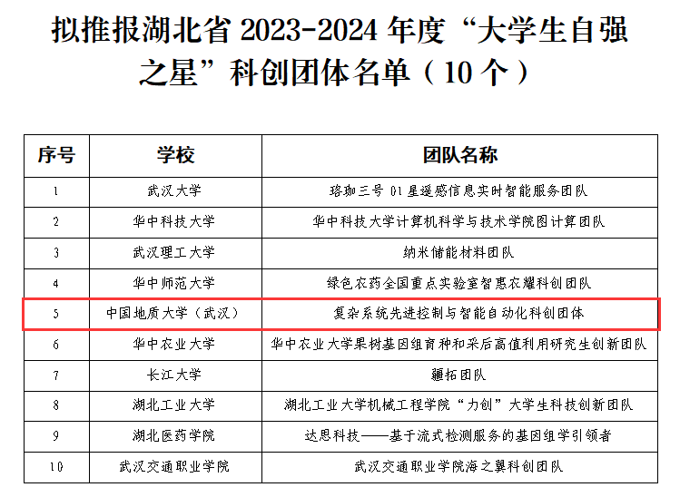 复杂系统先进控制与智能自动化科创团体,荣获湖北省2023-2024年度“大学生自强之星”称号。