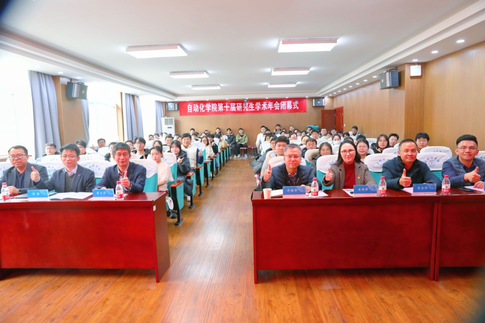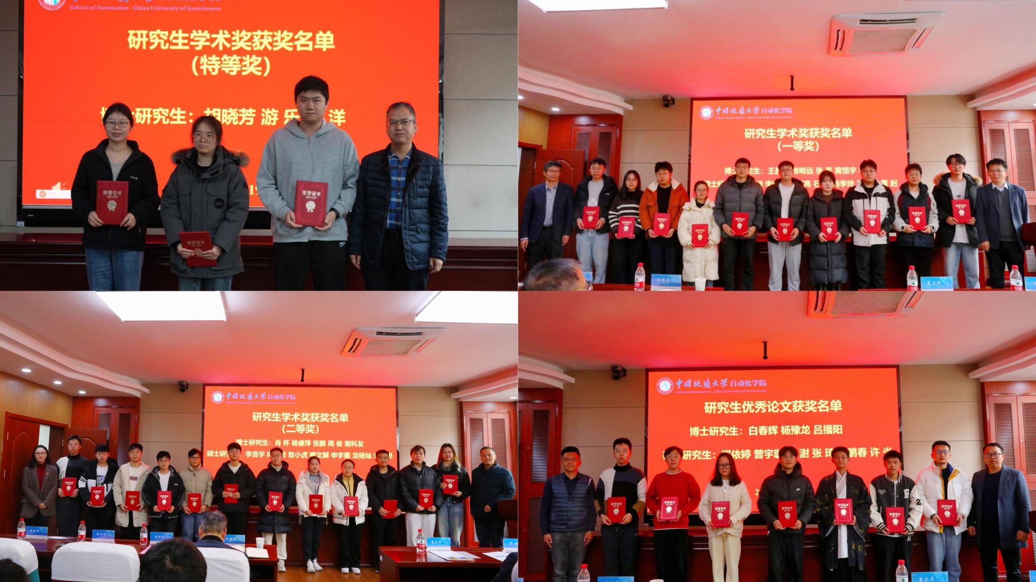随后,陈略峰教授宣读《自动化﹝2024﹞16号 关于表彰2024年研究生学术奖的决定》和《自动化﹝2024﹞17号 关于表彰第十届研究生科技论文报告会优秀论文奖的决定》,与会领导嘉宾为获奖研究生颁发证书并合影留念。