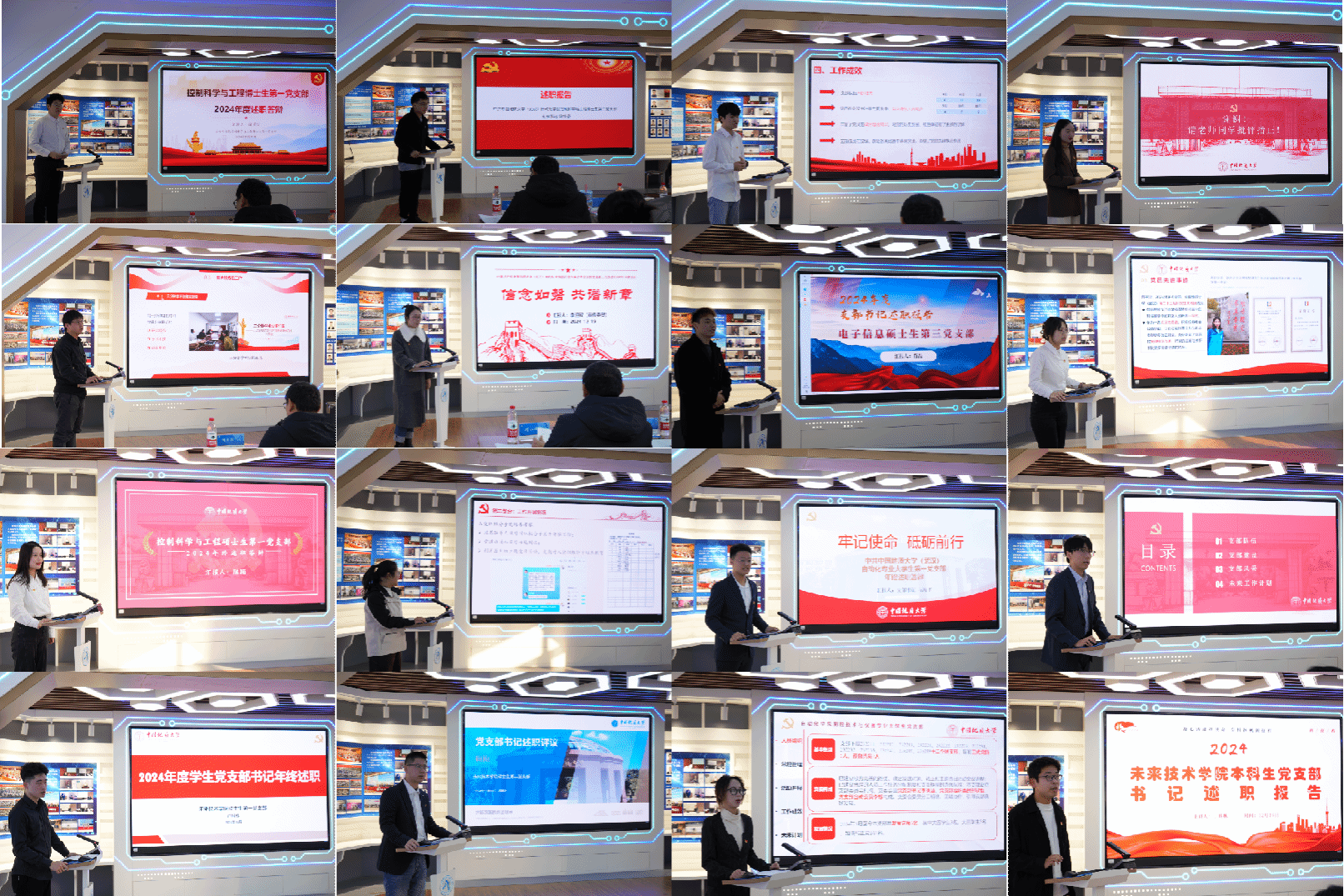 此次评议考核以书面述职和现场述职结合的形式进行。16个学生党支部书记对照党支部建设“七个有力”要求,聚焦“一支部一特色”,重点围绕2024年度履职情况、特色工作开展情况、存在的问题以及后续工作规划等内容进行述职汇报。与会人员采取“一评一述”的方式,充分肯定了各支部一年来的工作表现和精彩分享,并针对支部建设、特色工作、后续发展给出具体建议。