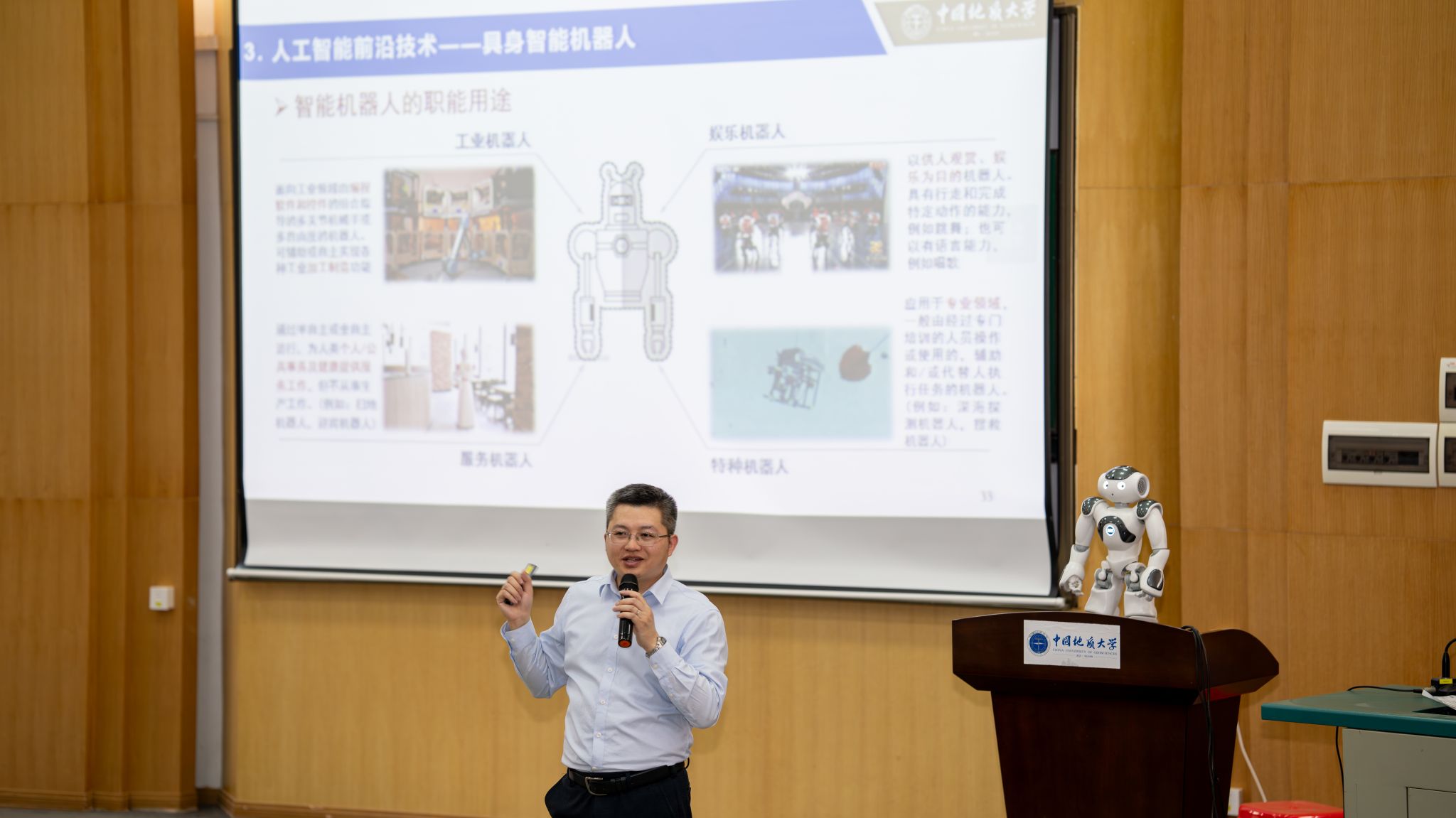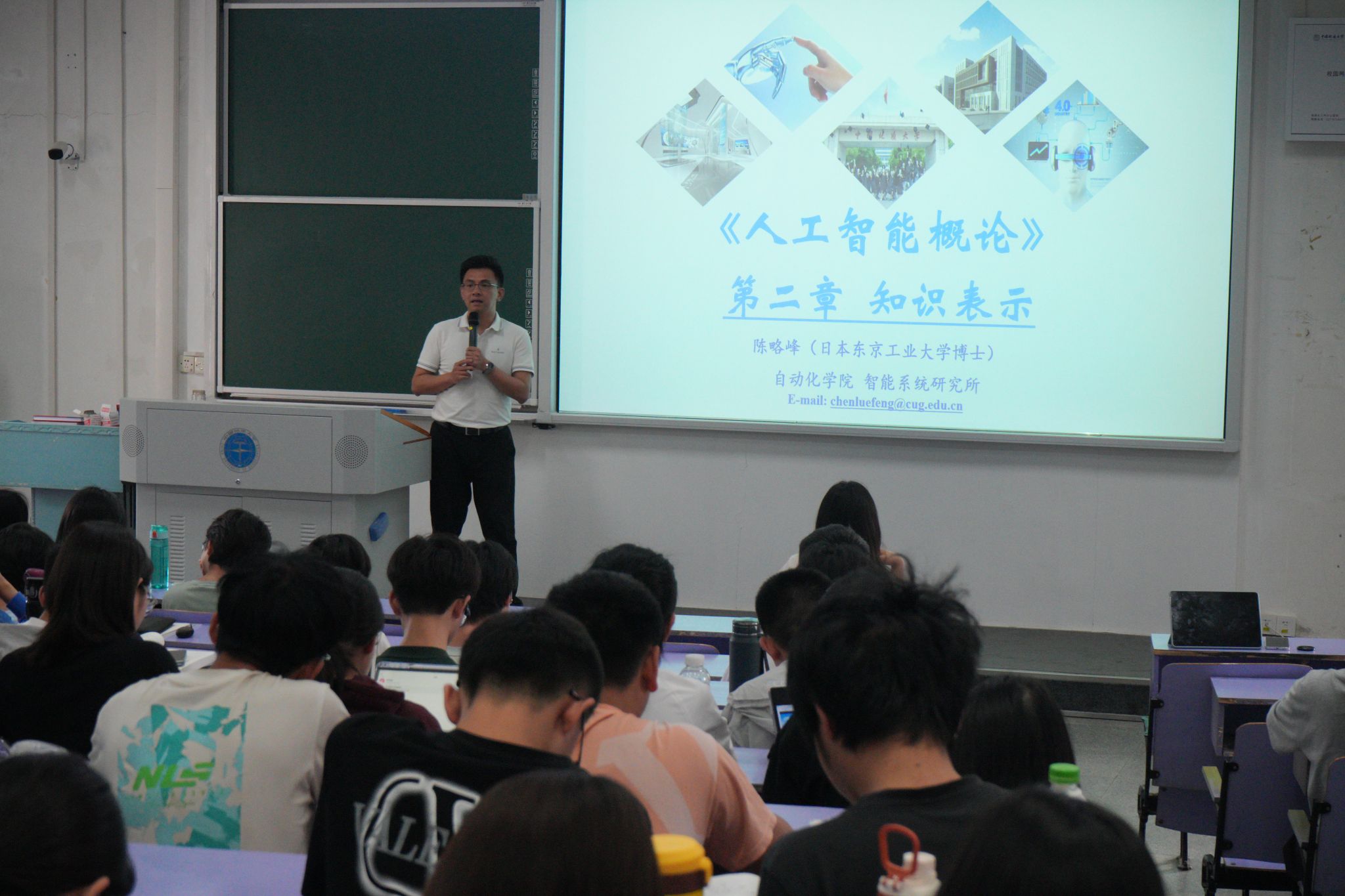 前沿引领,打造模块化课程体系:课程采用“基础理论+应用前沿”的模块化设计,由领域专家联合授课。刘振焘教授负责的《人工智能概述》和《情感计算与具身智能机器人》,解析基础理论与技术发展奠定基础,系统剖析情感识别、人机交互等关键技术,展望智能机器人在医疗、教育等领域的应用前景;陈略峰教授通过《知识表示》构建知识表示与推理框架,探秘人工智能的可解释性; 王峰和闫泽副教授共同讲授《机器学习》,通过聚焦经典案例弱化算法复杂度,从而降低学生对算法理解门槛;惠亚娟副教授讲述《脑科学与人工神经网络》,揭示生物智能与机器智能关联;胡杰教授《智能制造》以钢铁行业实例直观呈现智能控制技术应用;陆承达教授围绕《智能地球探测》,突出地学特色应用场景;刘小波教授在《生成式人工智能》专题中,深入浅出地讲解大语言模型、图像生成等技术原理,解读AI技术变革。所有模块均经教学团队的精心设计和反复打磨,确保教学内容在知识深度与通识广度方面达到最佳平衡。