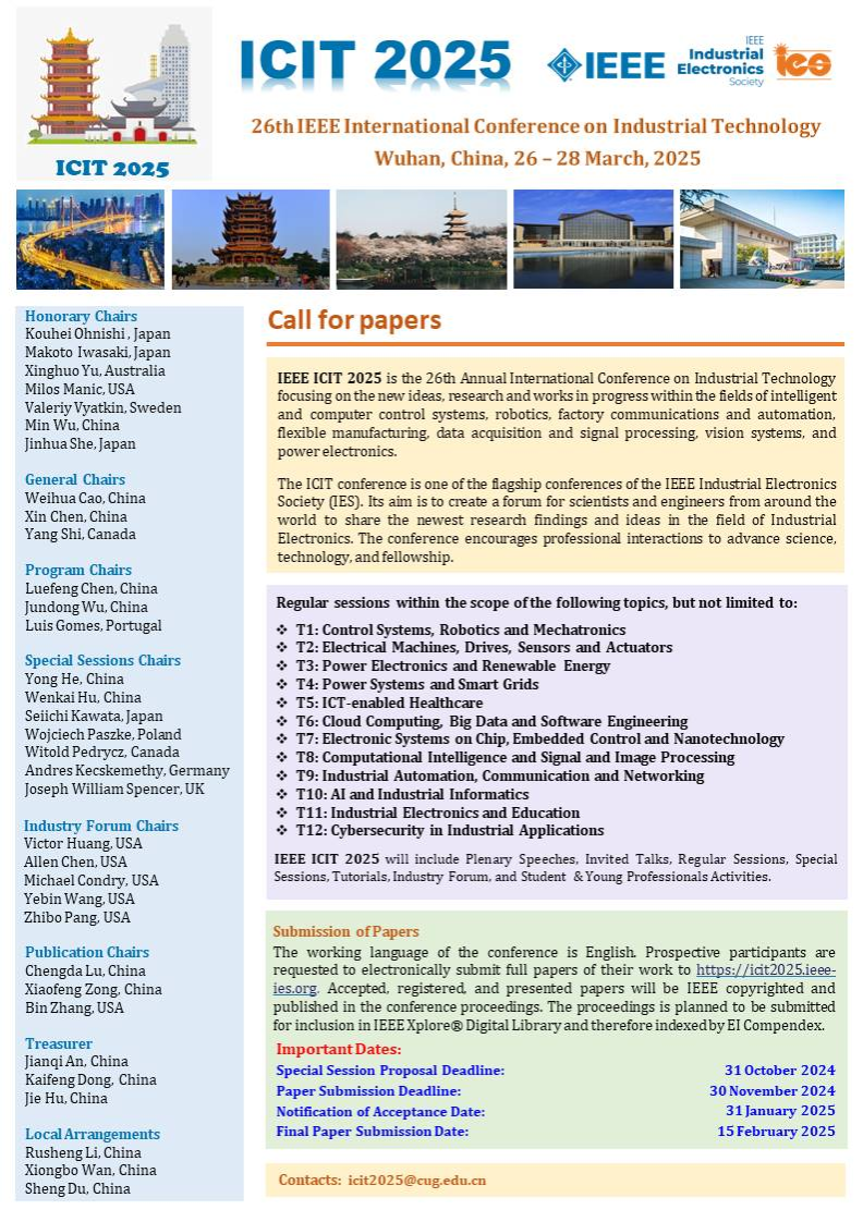 承办。ICIT2025重点关注智能和计算机控制系统、机器人技术、工厂通信和自动化、柔性制造、数据采集和信号处理、视觉系统和电力电子等领域的新思想、新研究和新进展。