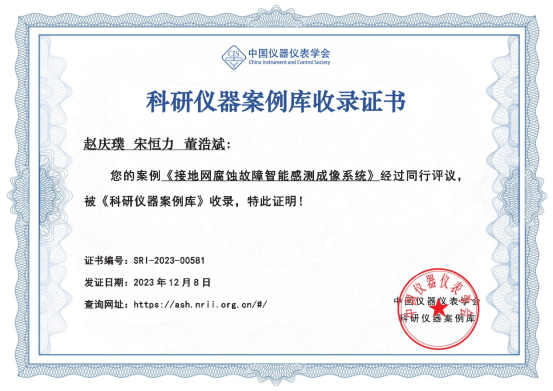 申报的《接地网腐蚀故障智能感测成像系统》应用案例通过评审,入选中国仪器仪表学会“科研仪器案例库”,并获收录证书。