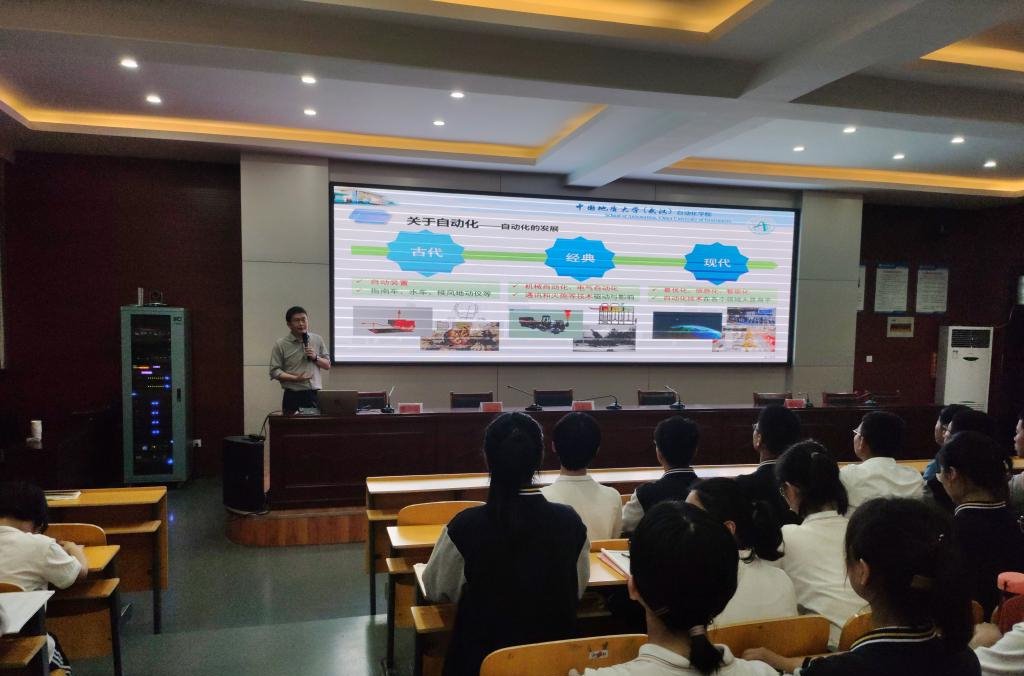 在自动化和人工智能领域的科研和应用实践。鼓励学生们投身到自动化和人工智能领域,立志为国家建设作出贡献。曹卫华教授幽默睿智、旁征博引的演讲,吸引了在场的每一位同学。丰富的自动化知识,腾飞的自动化科研事业,可喜的自动化科研成果,奋进的自动化科研人精神……让淮中学子对自动化、智能化知识有了深刻的认识,并极大地激发了同学们对科学的热情和对自动化研究事业的向往。