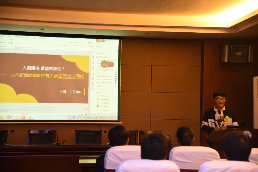 “C艾”团队以《文化认同》为主题开展团会。团队首先以屠呦呦和莫言获奖事件引出文化认同这一主题;随后分析了大学生文化认同的现状及重要性;然后,向同学们阐释文化认同感应该怎样培育和提高、应该有怎样的指向和动力等;最后,主讲人将我国部分文化产品、文化习俗与在场的同学们分享。