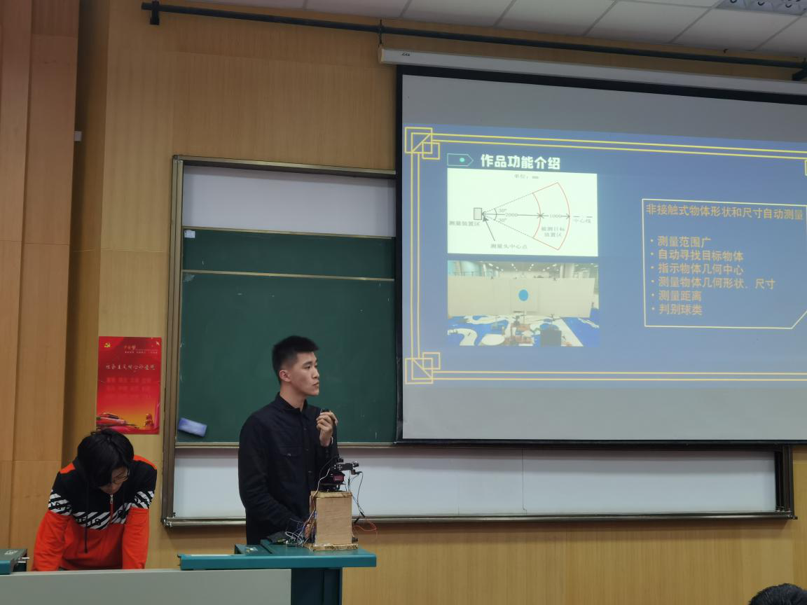 在答辩环节,参赛的八组同学对自己的参赛作品进行讲解,具体说明自己的创作目的、制作原理、应用前景等,参赛作品选题广泛,涉及机器人、非接触式测量、控制等多个热门领域,参赛选手们理论与实践相结合,部分团队展示了自己的实体研究成果,给我们带来了精彩的展示: