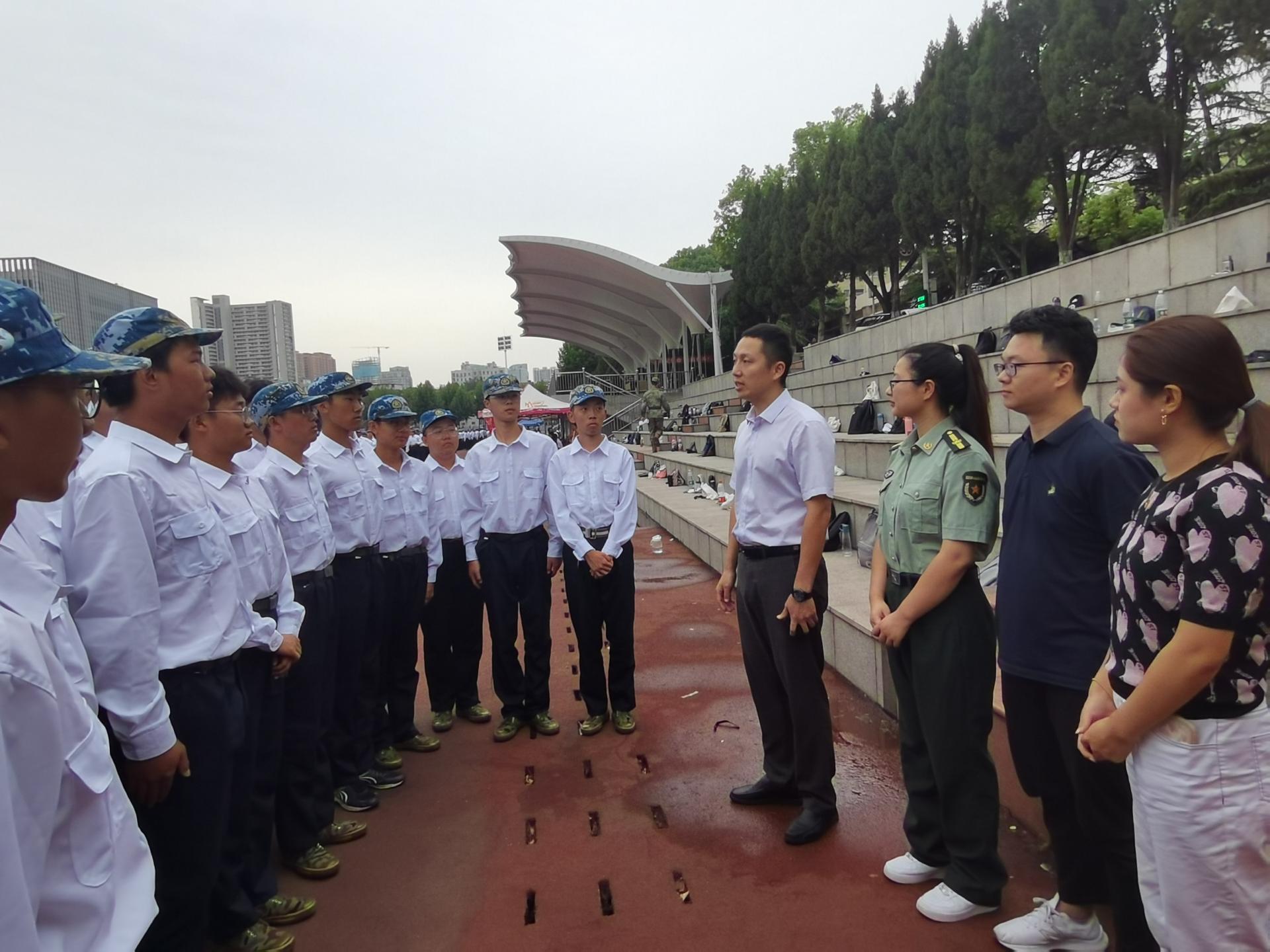 党委副书记王向东,学工组辅导员刘一荻、孙静、黄兰华、王艺霖一行来到新生军训场地,代表学院亲切慰问成人色情
